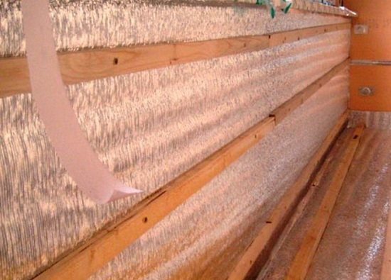 Ламелите се монтират на стените с помощта на дюбели, след което пенофолът се монтира с припокриване от 10-15 сантиметра и се закрепва с помощта на строителен телбод.