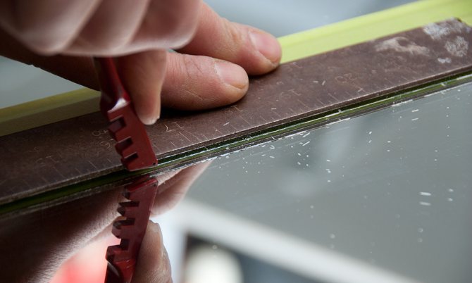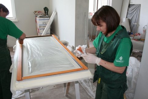 Les fenêtres à double vitrage peuvent être achetées directement à l'usine, mais le verre ordinaire est le plus souvent utilisé pour une maison de campagne, qui est coupé sur place. La taille du verre doit être légèrement plus petite que l'ouverture pour cela, après avoir essayé le verre, un mastic est appliqué sur la rainure, le verre y est appliqué, la perle de vitrage empêche le verre de tomber hors du cadre. La perle de vitrage elle-même est fixée au cadre avec des clous minces.