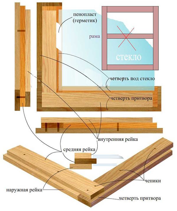 Les rainures, en règle générale, ont un évidement pour les feuilles de verre de 10 millimètres de haut et 14 millimètres de large. L'agrafe qui fixera le verre mesure 10 millimètres de large (sur la base d'un verre de 4 millimètres d'épaisseur). La rainure de la boîte est légèrement plus grande et a une section de 15 sur 20 millimètres.Fabriquer des fenêtres en bois de vos propres mains est en général un processus simple, ainsi que l'assemblage de la partie la plus difficile (cadre). Tout d'abord, les cadres de fenêtre en bois sont assemblés de la même manière que la boîte a été assemblée. Leurs éléments sont reliés à l'aide de pointes et de rainures, qui sont collées avec de la colle. Parfois, les cadres sont en plus fixés avec des coins métalliques (à l'aide de vis autotaraudeuses). Bien que les coins offrent une résistance structurelle supplémentaire, ils affectent négativement leur apparence statique.