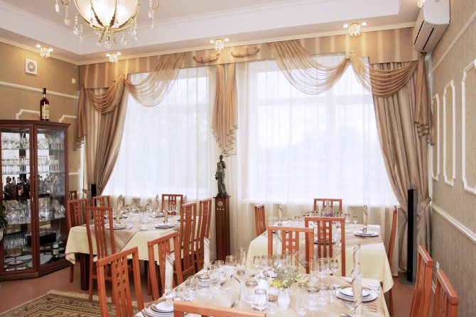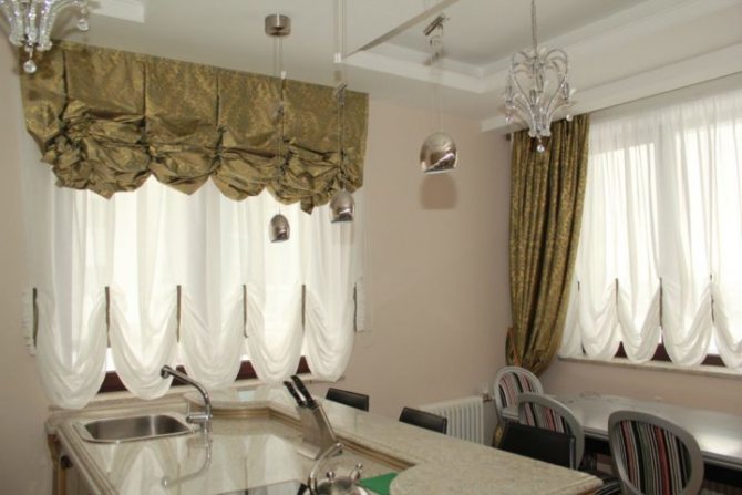 Pour le classique et le baroque, les rideaux en tissus luxueux avec des draperies volumineuses doivent être préférés. Avouons-le, c'est loin d'être l'option la plus appropriée pour les cuisines. Tout d'abord, en raison des spécificités des locaux. Deuxièmement, de tels rideaux mangeront visuellement l'espace dans une cuisine déjà petite. Ce sont exactement les mêmes dans la plupart des appartements de notre pays et dans l'espace post-soviétique.