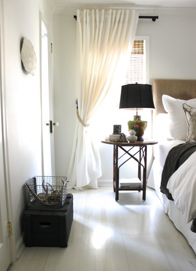 Le rideau gris se marie bien avec les murs blancs et les meubles bruns