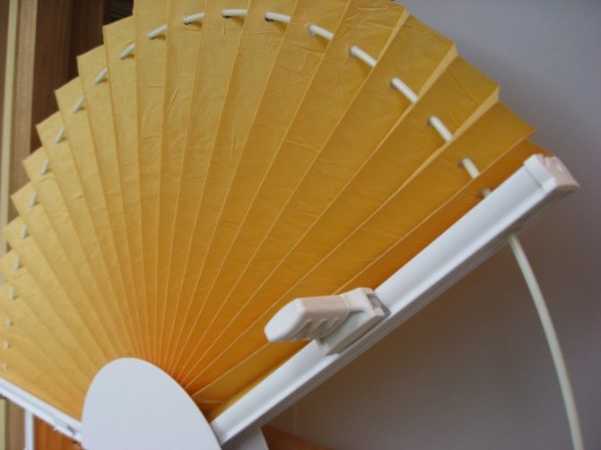 Les stores plissés sont une autre option adaptée aux fenêtres de forme inhabituelle. Ils sont fabriqués d'une seule pièce et coulissent le long des guides. Le plus souvent, ils sont constitués de plusieurs éléments, selon des formes géométriques simples, dans lesquelles la fenêtre peut être brisée. Séparément, une partie mobile rectangulaire et une partie fixe triangulaire ou semi-circulaire sont réalisées. Les technologies modernes permettent de fabriquer des stores plissés entièrement coulissants pour des fenêtres cintrées et même rondes, qui s'ouvrent comme un ventilateur.