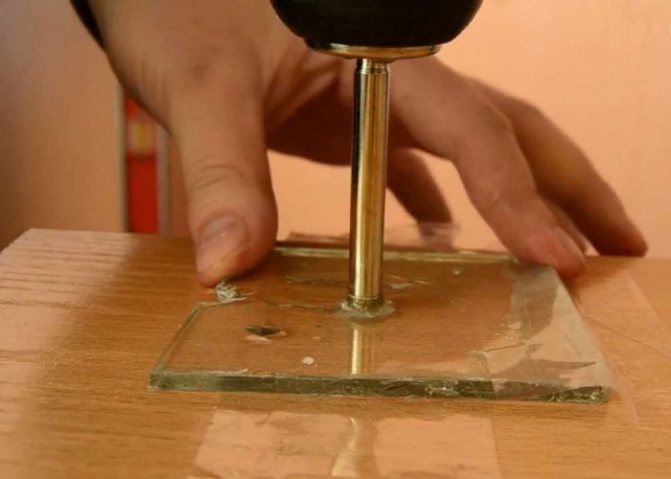 Pour obtenir de gros trous, vous devrez utiliser un coupe-verre. Commencez par dessiner le cercle requis sur le verre avec un marqueur. Percez un petit trou au centre du cercle avec une perceuse avec une perceuse à plumes. Ensuite, nous attachons le coupe-verre avec un cordon de la longueur requise, dont l'extrémité est fixée dans ce trou. Avec précaution et lentement, en gardant le coupe-verre dans une position strictement verticale, coupez un sillon sur le verre le long de la ligne marquée. Nous dessinons le cercle entier à enlever à l'aide d'un coupe-verre et d'une règle avec plusieurs rainures du trou central au cercle. Il reste maintenant à casser soigneusement les segments de ce cercle à coups légers du marteau pour qu'ils tombent hors du verre. Après toute la face du trou résultant, moudre et ramener à un état lisse.