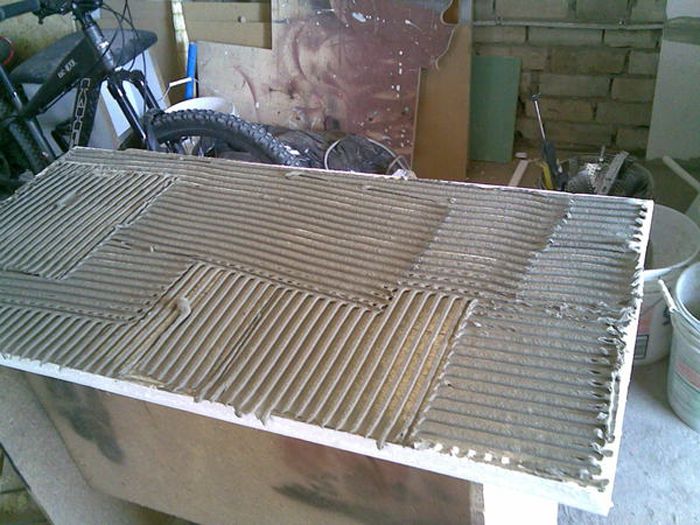 Si vous préférez un mélange sec, vous aurez besoin d'une perceuse avec un mélangeur. Pour appliquer une telle colle, vous pouvez utiliser une spatule en forme de peigne, mais vous aurez besoin d'une petite spatule comme outil improvisé dans le travail, avec son aide, vous pourrez éliminer l'excès de colle.