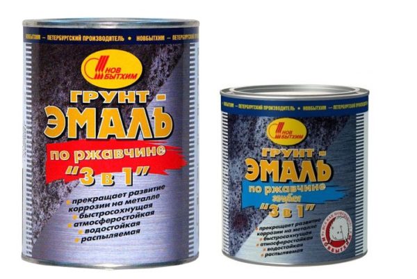 - Composition 3 en 1 pour surfaces métalliques... Une composition spéciale composée de peinture, d'apprêt et de traitement anti-corrosion. Après l'application, la surface sera protégée de manière fiable contre la rouille pendant de nombreuses années. Si vous avez du métal sans foyers de corrosion, vous pouvez utiliser de la terre ordinaire pour le métal, son prix est beaucoup plus bas;