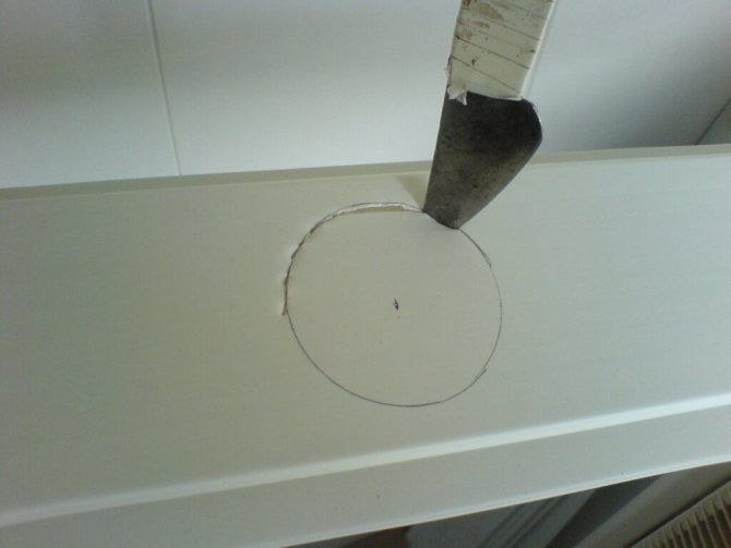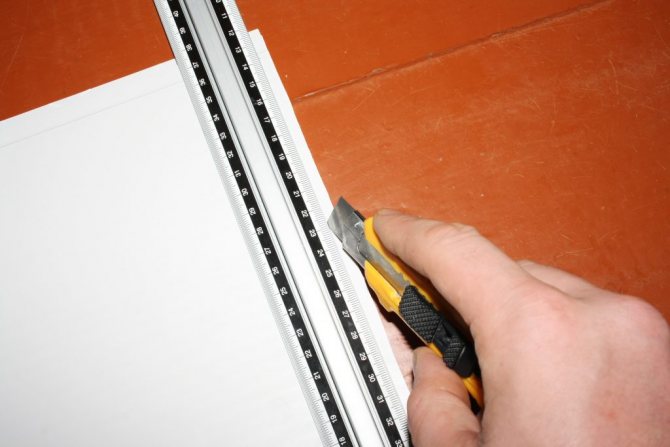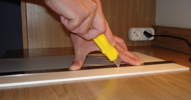 Lors de l'utilisation d'un couteau de construction ou de bureau, le panneau est marqué, puis posé sur du carton ou la partie coupée est laissée en suspension. Après cela, en poussant à travers les côtés avant et arrière du matériau de finition, ils séparent les parties inutiles. S'il reste une grande surface de pièce en plastique non réclamée, il est préférable de placer ou de remplacer un support sous celle-ci, afin d'éviter de plier ou de déformer la pièce.