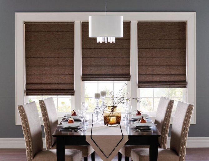 Une excellente option pour protéger une pièce du soleil est de suspendre des stores romains. Lorsqu'ils sont dépliés, ils sont une toile plate ordinaire, mais lorsqu'ils sont soulevés, des plis horizontaux se forment dessus, superposés les uns aux autres. Des matériaux naturels sont généralement utilisés pour créer des stores romains. Ils sont bien adaptés aux intérieurs classiques et modernes.