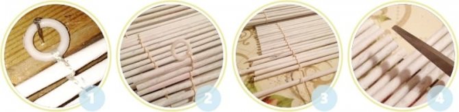 Après la fin de la fixation, un lacet décoratif est cousu à la tresse à partir de l'arrière des stores près de la première bande supérieure, dont la deuxième extrémité est amenée vers l'avant. En tirant cet élément, vous pouvez tourner les planches à l'angle souhaité.
