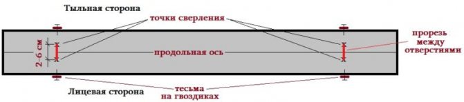 Sur la corniche supérieure, les trous sont faits à la même distance des bords, mais dans le sens perpendiculaire - de l'avant vers l'arrière, et le diamètre doit assurer le libre passage du cordon, en tenant compte du coude à la coins.