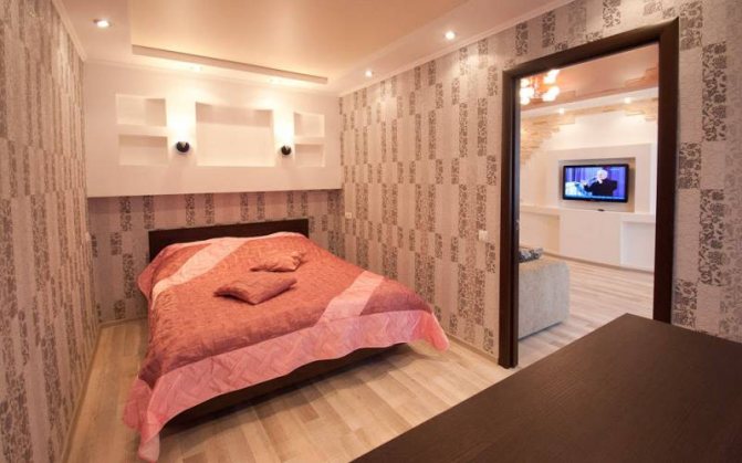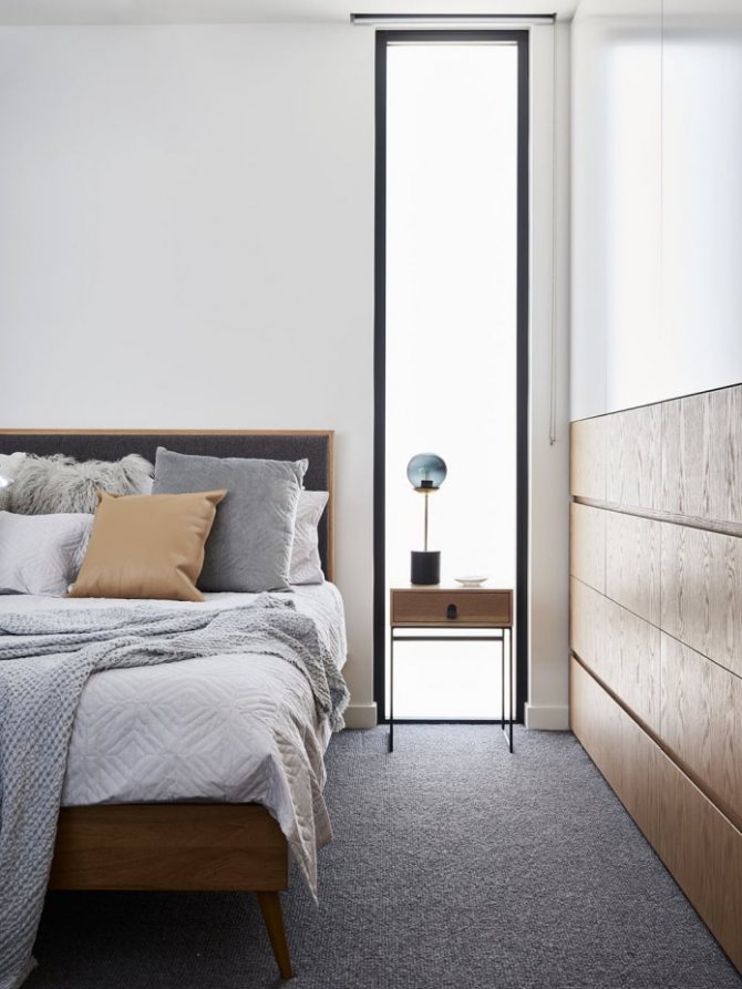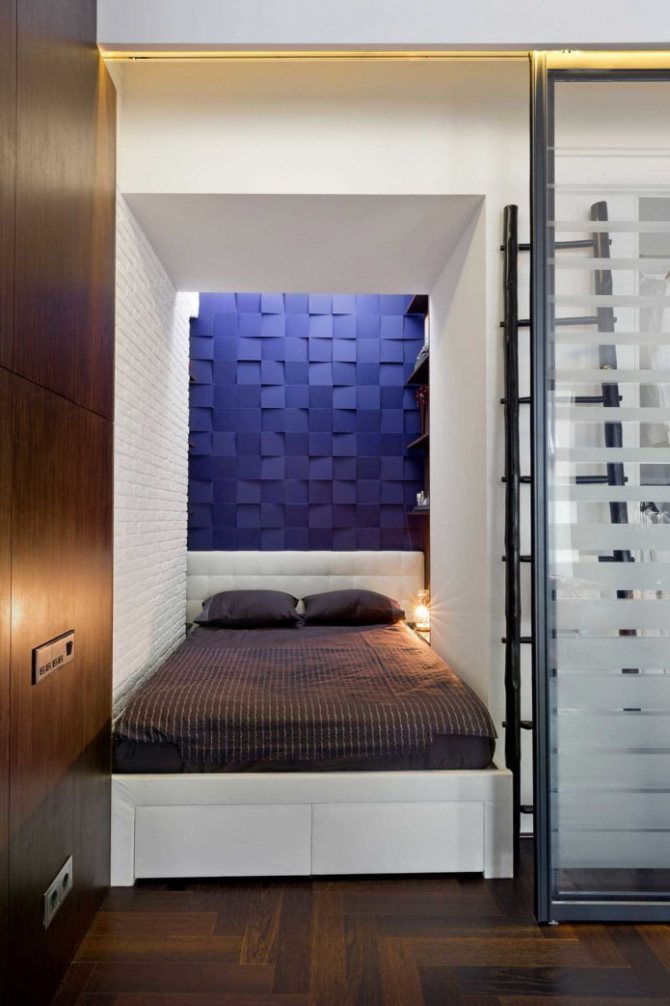 Si la largeur de la niche ne permet pas un lit avec des tables, choisissez un modèle avec des étagères en tête ou accrochez-les au-dessus du lit. Cette astuce vous permettra d'abandonner les tables de chevet et de ne pas perdre de fonctionnalité.