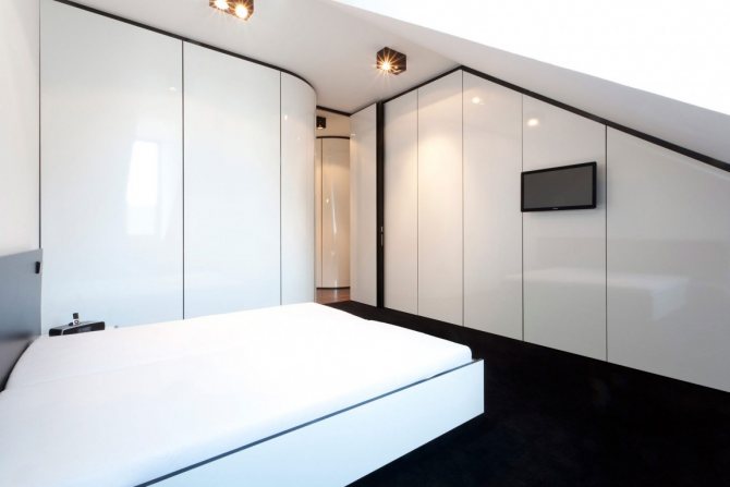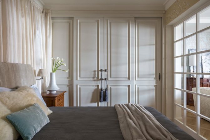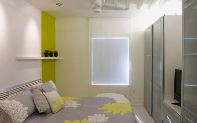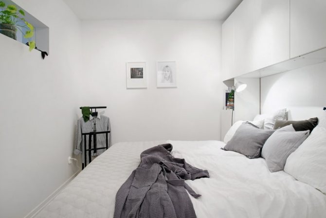Décorer l'armoire dans la couleur du mur vous permettra de la dissoudre dans une petite chambre et de la rendre presque invisible. Placez une structure séparée avec des portes coulissantes ou placez des sections des deux côtés et au-dessus du lit.
