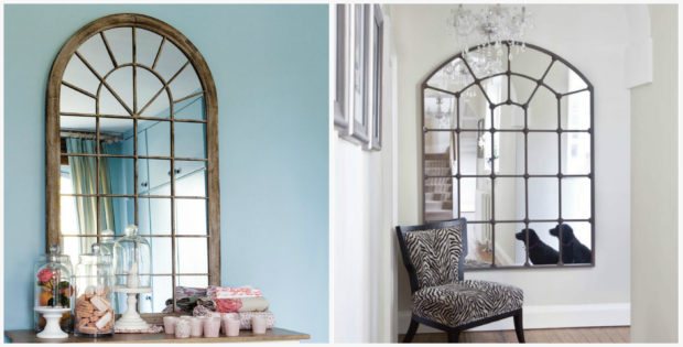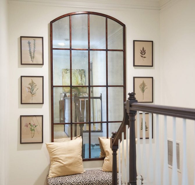 - fenêtre miroir avec imitation de la division en parties. Cette décision vous fait vraiment croire qu'il y a une fenêtre dans la pièce, surtout si vous trouvez le bon endroit et le plus naturel pour cela. De plus, le miroir agrandit l'espace et double la lumière rare - tout un wagon d'avantages. Vous pouvez compléter un tel miroir avec des rideaux ou un rideau lumineux, mais l'essentiel est que les textiles ne recouvrent que légèrement la surface du miroir. Envisagez de sabler le miroir;