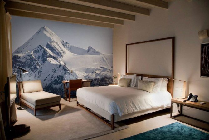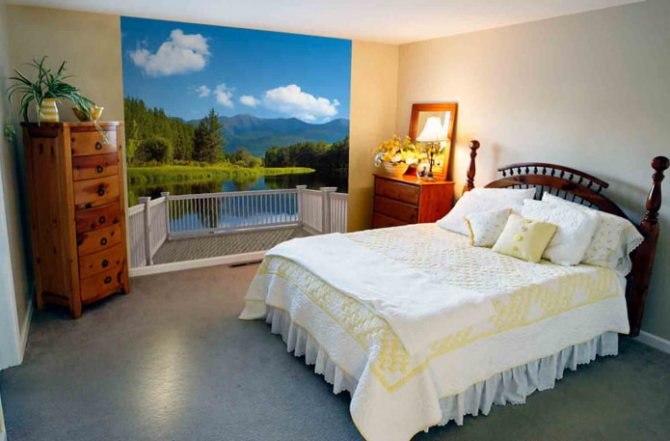 - Fond d'écran photo. Deviendra un accent lumineux dans la chambre, si vous choisissez le bon. Les images panoramiques, l'agrandissement de la pièce et l'imitation d'une fenêtre ou d'un balcon sont possibles.