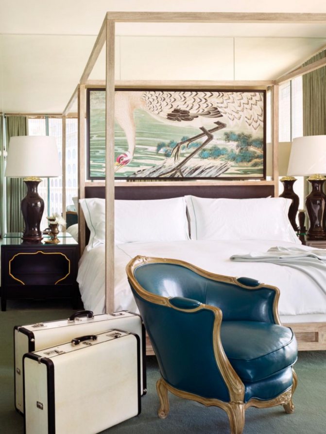 La quantité de meubles dépend principalement de la taille de la chambre: dans une petite, il y a suffisamment de lit avec ou sans tables d'appoint; dans une plus spacieuse, placez une armoire ou une table supplémentaire.
