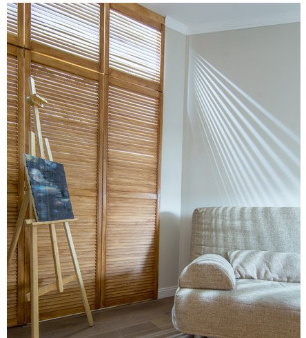 Parfois, des idées naissent lorsque vous ne les attendez pas du tout. Par exemple, au lieu des portes d'une armoire conventionnelle, vous pouvez utiliser des volets (une structure à ossature avec de nombreux panneaux horizontaux et un petit espace entre eux), et grâce à la bande LED qui se cache derrière les portes, il semble que la lumière du soleil tombe dans la pièce par une fenêtre avec des volets. L'effet est si fort que même votre cerveau, qui connaît le secret de la pièce, percevra le flux de lumière artificielle comme des rayons naturels.