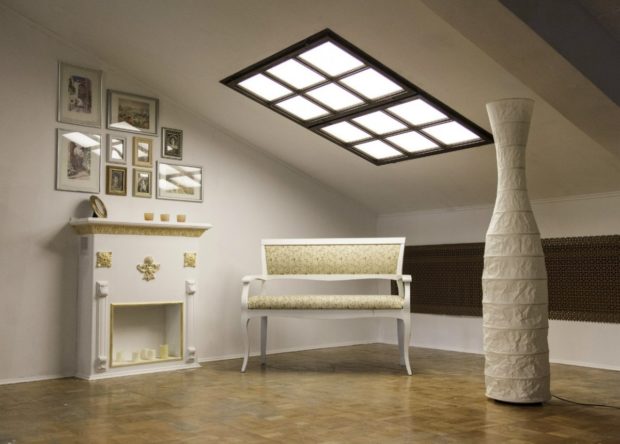 - au plafond, vous pouvez appliquer la même technologie que lors de la disposition de fausses fenêtres sur le mur. Dans l'approfondissement se crée rétroéclairagequi répète la température de la lumière du jour, la structure est fermée verre dépoli ou verre avec une image du ciel, branches contre le ciel, etc. Certes, cette méthode nécessitera la construction d'une boîte en placoplâtre (technologie des plafonds suspendus), et cela prend plusieurs centimètres de hauteur, mais une source lumineuse volumétrique supplémentaire compense ces pertes.