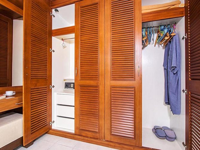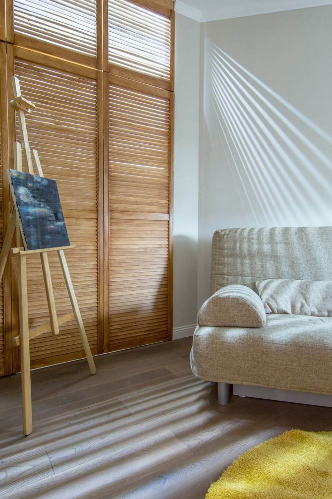 - Design élégant. La garde-robe jalousie est élégante et soignée, la variété d'essences et de couleurs de bois vous permet d'installer de telles armoires dans n'importe quelle pièce, que ce soit une chambre, un salon ou un couloir.
