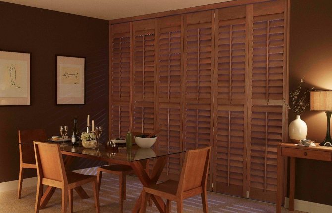 - Constructions au lieu de portes intérieures et de cloisons. C'est un excellent choix pour les pièces qui ne nécessitent pas d'isolation permanente, comme un salon. Une cloison en jalousie aidera lors de la combinaison d'une cuisine et d'un salon ou d'une toilette avec une baignoire.
