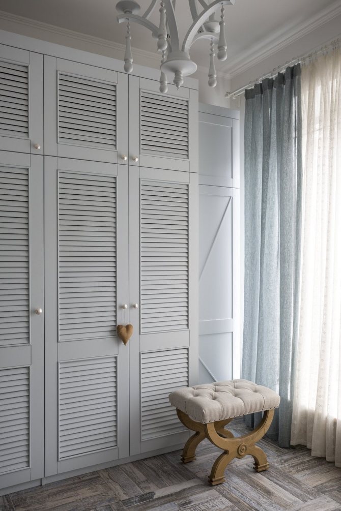 Ces modèles d'armoires sont pertinents à la fois dans les intérieurs modernes et classiques. Les stores ont été utilisés comme élément décoratif il y a des centaines d'années. Pour les intérieurs traditionnels, une excellente solution serait une armoire pivotante avec des façades à persiennes, pour les intérieurs modernes - des armoires coulissantes avec guides.