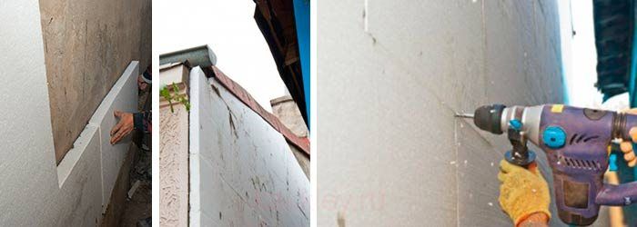 Fixation de la mousse au béton à l'aide de "parapluies" pour une plus grande résistance - Pour que le panneau de gypse et le polystyrène expansé soient solidement fixés autour du périmètre, plus de chevilles doivent être vissées au niveau des joints, des coins, près des portes et des fenêtres. Vous devez calculer de manière à ce qu'il y ait environ 6 à 8 chevilles par mètre carré.