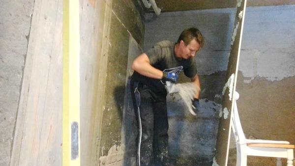 - Lorsque l'apprêt a séché, la première couche de plâtre est appliquée sur les plaques de plâtre, puis poncée avec du papier de verre.