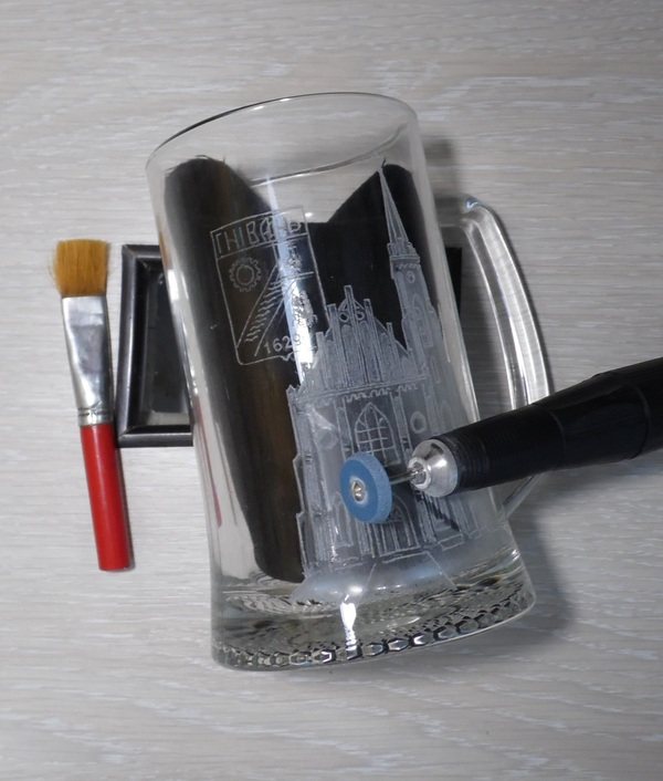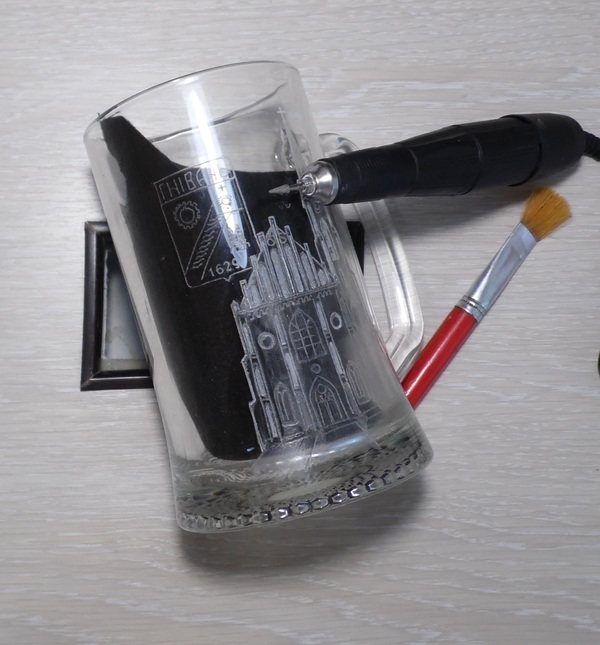 Il n'est pas nécessaire d'exercer une pression sur l'outil, son propre poids est suffisant. J'applique un passe-partout sur toute la surface du dessin. Cette opération est assez poussiéreuse. L'utilisation d'un écran facial est obligatoire. Si nécessaire, je balaie la poussière dans l'ouverture du capot avec une brosse. Vous pouvez également utiliser un porralon humide, mais vous devez ensuite attendre que la surface du verre sèche, sur une surface humide, les petits détails du motif sont difficiles à distinguer.