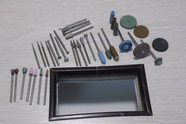 Dans le processus de gravure, j'utilise parfois d'autres fraises et pierres. Sur la gauche se trouvent des pierres pour le matage et le nettoyage des carénages après avoir travaillé avec des fraises à gros grains. Au centre, il y a des fraises diamantées de différentes formes et tailles de grains. A droite, consommables de polissage, différentes couleurs, différentes fractions de volcanite. J'achète toutes les fraises nécessaires dans un magasin de matériel médical, dans la section dentisterie. Comment serait-il. Lien vers la master class sur le site du Pays des Maîtres https://stranamasterov.ru/node/972210?c=popular_inf_2163%2C45. Au revoir à tous.