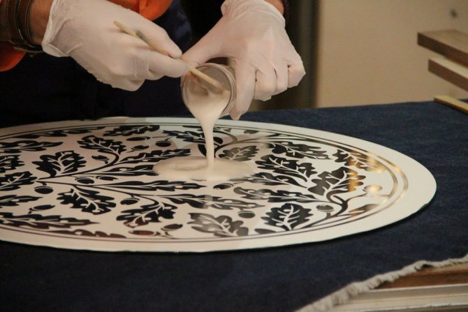 Deuxième étape. Appliquez doucement la pâte de gravure sur le pochoir avec un pinceau et répartissez-la uniformément. Laisser poser dix minutes, puis retirer l'excédent avec le même pinceau (vous pouvez le renvoyer dans le pot, la pâte ne perdra pas ses propriétés). Après encore dix minutes, rincez le reste de la pâte et retirez le pochoir. La gravure est prête.