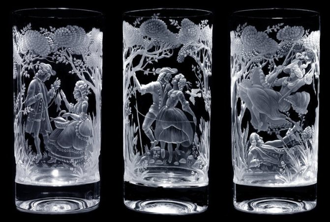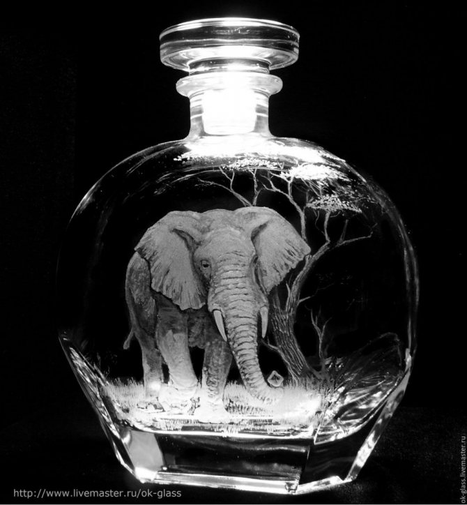 Comme vous le savez, le verre est un matériau assez fragile. Il n'est pas difficile de le casser, le moindre effort - et la fissure a disparu. À cet égard, la gravure au laser sur le verre est l'option la plus appropriée pour le traiter. Le faisceau laser vous permettra d'appliquer délicatement l'image souhaitée sur la surface et n'endommagera pas le produit lui-même, et le processus lui-même ne prendra pas beaucoup de temps. Ce type de gravure transmettra le plus fidèlement l'intrigue avec un grand nombre de petits détails. Le processus est entièrement automatisé, de sorte que toute erreur dans le travail lui-même est exclue. Comment est-il? Essentiellement, il s'agit de pulvériser la couche de surface extérieure du produit à l'aide d'un équipement spécial.C'est grâce à l'installation laser que les plus petits et les plus fins détails du croquis peuvent être trahis, inaccessibles aux autres méthodes.