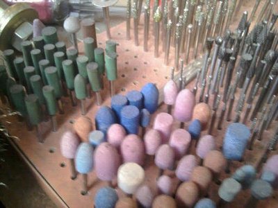 Cette fois je n'ai utilisé que 4 consommables : un gros cône droit (marquage, approfondissement des traits), un petit cône droit (dessin de petites choses), une pierre abrasive fine (mate de surface), un disque en caoutchouc avec vulcanite (polissage). Machine au bore STRONG 204 102L.