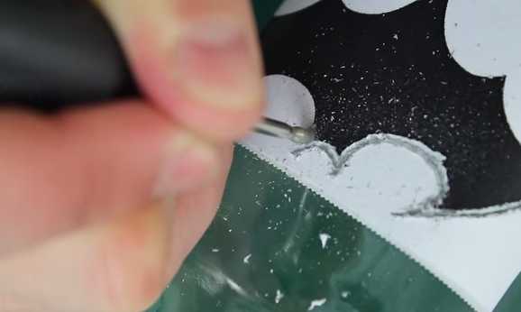Deuxième étape. Avec des mouvements nets et légers, gravez d'abord le long des lignes intérieures de l'image, puis le long des lignes extérieures. De temps en temps, vous devez faire une pause et nettoyer la buse de la poussière de verre. Humidifiez le papier calque si nécessaire ou appliquez de l'eau avec une éponge.