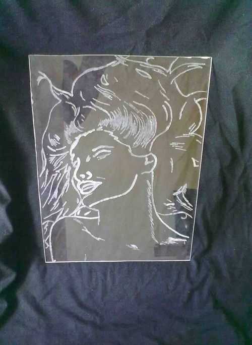 Premier pas. Dégraissez la surface avec de l'alcool. Découpez un morceau de film d'au moins 3 cm de plus que le dessin de chaque côté. Collez-le sur le verre, lissez-le soigneusement, il est important qu'il n'y ait pas de bulles. Placez le dessin sur le dessus du film et fixez-le avec du ruban adhésif. En appuyant doucement et uniformément sur la lame, coupez l'image avec un couteau de bureau afin qu'elle soit également coupée sur le film. Retirez le papier, le ruban adhésif et la partie intérieure découpée du film. Le pochoir est prêt.
