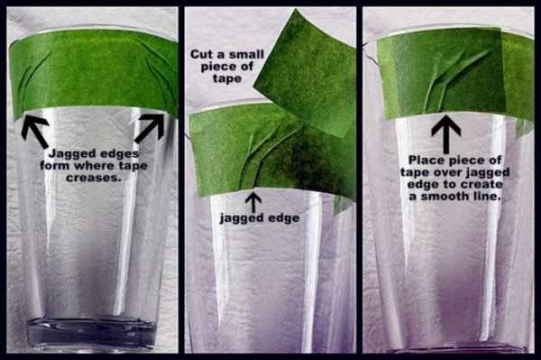 Le ruban de masquage limite la surface à graver et protège le reste du verre. Vérifiez si le ruban est collé en ligne droite, auquel cas corrigez-le. Si le verre est arrondi (par exemple, comme un verre), le ruban adhésif ne repose pas à plat, il y a beaucoup de "rides". Pour cette raison, la bordure inférieure n'est pas tout à fait droite, ce qui semblera plus tard un peu bâclée. Par conséquent, si nécessaire, utilisez quelques morceaux de ruban adhésif, comme sur la photo, pour que la ligne soit uniforme.