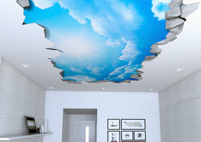 Si vous combinez un plafond tendu et un plafond suspendu, vous pouvez obtenir une structure très efficace. Avec cette option, une toile photo extensible est utilisée, qui représente les étoiles, l'espace ou le ciel. Actuellement, la solution la plus à la mode consiste à utiliser des plafonds tendus rétroéclairés scintillants. À propos, à l'aide de plafonds tendus, vous pouvez créer une fenêtre dôme originale au plafond, et si vous combinez deux technologies - monter un plafond tendu et suspendre un plafond en plaques de plâtre, vous pouvez construire un plafond incliné avec une fausse fenêtre à partir de où vous pouvez voir les branches des arbres et le ciel. Grâce à cela, vous obtiendrez une sorte d'imitation du grenier.