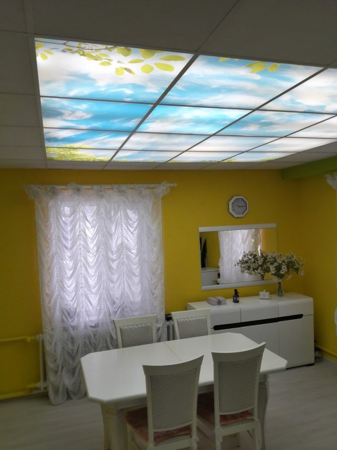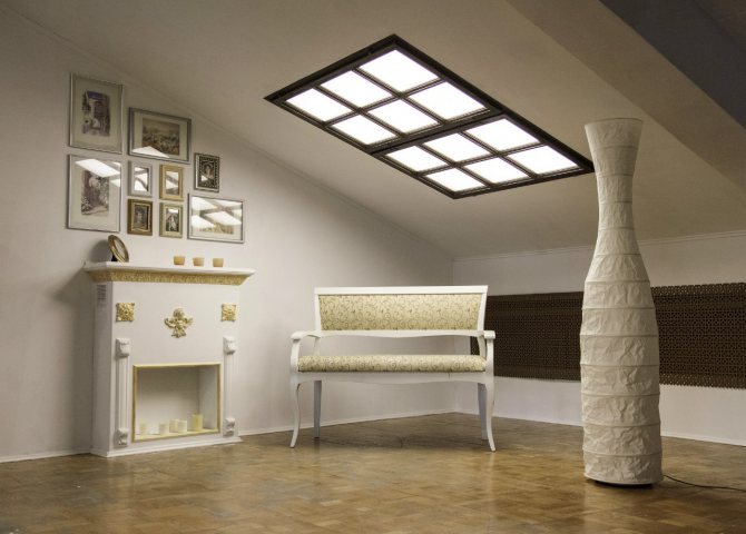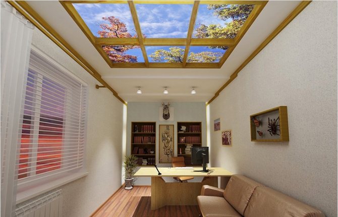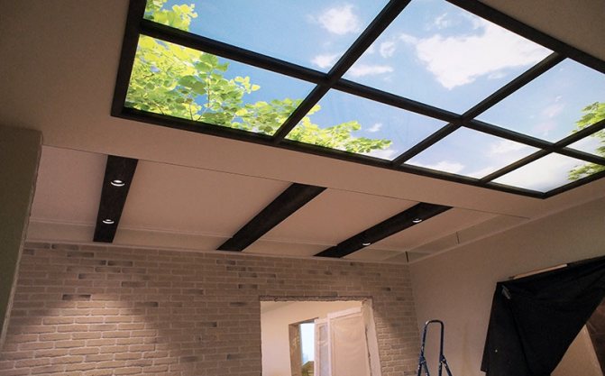 Séparément, il est nécessaire de considérer les fausses fenêtres, situées au plafond. De plus, les faux plafonds sont aujourd'hui plus fréquents que les murs. De telles fenêtres peuvent être créées sur un plafond plat, mais les fausses fenêtres sur un faux plafond semblent plus impressionnantes. Le résultat est l'effet d'un toit en verre.Bien sûr, cette option ne pourra pas remplacer l'atmosphère époustouflante d'une pièce par une vraie verrière, mais après avoir installé une telle fausse fenêtre, vous aurez au moins une illusion.