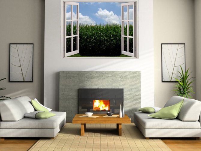 Papier peint photo sous la forme d'une fausse fenêtre au-dessus de la cheminée