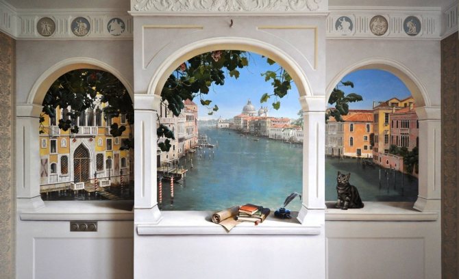 Pour créer l'illusion d'une porte, vous devez trouver un vrai maître qui sera capable de travailler tous les détails pour créer une illusion d'optique. À l'aide d'une peinture intéressante sur le mur, vous pouvez facilement masquer les imperfections de la pièce et l'agrandir visuellement.