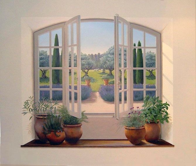 Une fausse fenêtre peut être dessinée et vous pouvez dessiner des volets internes, un cadre et un paysage à l'extérieur de la fenêtre.Les fenêtres tirées encadrées de vrais rideaux, rideaux, appuis de fenêtre, stores et volets seront très intéressantes. Si vous le souhaitez, vous pouvez créer une version plus originale, où un rideau sera dessiné et le second réel. Pour créer vous-même une telle fausse fenêtre, vous devez avoir une capacité artistique exceptionnelle. Dans le cas où vous ne savez pas dessiner, vous pouvez vous tourner vers un décorateur pour obtenir de l'aide.