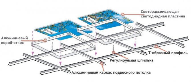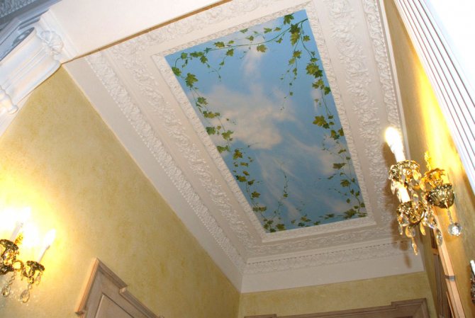 Cette idée s'applique aux plafonds suspendus denses et de haute qualité. Avec un tel puits de lumière, la pièce semblera toujours lumineuse. Le système de fabrication de ce plafond est complexe. Le plafond est monté sur des cintres immédiatement avec des niches. Le verre et l'éclairage sont montés dans des niches. Des papiers peints photo sont installés sur la vitre. La reliure est imitée par des moulures.