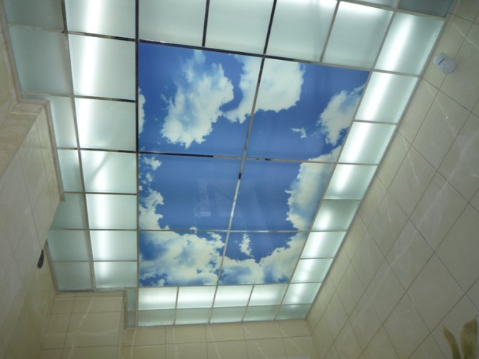 Si la pièce est très petite et sombre et qu'il n'y a pas de mur libre de meubles, une fausse fenêtre avec éclairage peut être installée au plafond. Avec ce design, l'espace est transformé. Cette méthode est souvent utilisée lors de la décoration du plafond de la salle de bain.Par exemple, si vous décorez le plafond sous la forme d'un ciel ouvert, prendre une douche ou un bain dans une telle pièce sera particulièrement agréable. Les fausses fenêtres dans la salle de bain sont utilisées assez souvent.
