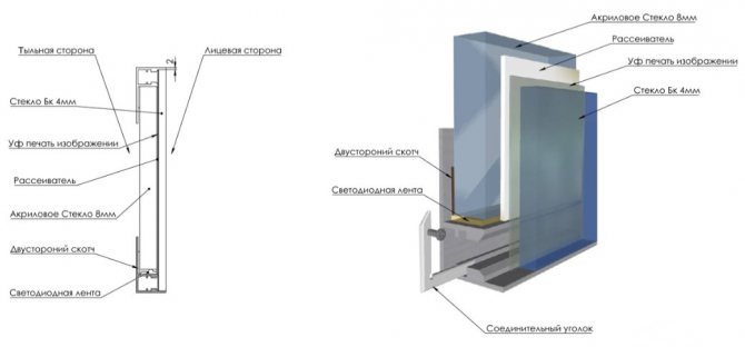 Un tel panneau lumineux est réalisé en montant l'image souhaitée dans une boîte. La boîte est en plastique ou en plexiglas. Une bande LED est montée le long des bords de la boîte. Il est installé à 4 centimètres de distance. Des sections de ruban sont soudées séquentiellement à partir d'une bobine. La sortie vers le transformateur est effectuée. Ensuite, les fils sont dirigés vers la prise. L'image sélectionnée est collée sur le couvercle de la boîte. Les parois extérieures de la structure sont scellées avec un matériau qui ne laisse pas passer la lumière. L'éclairage est ajusté aux paramètres souhaités et le couvercle est installé.