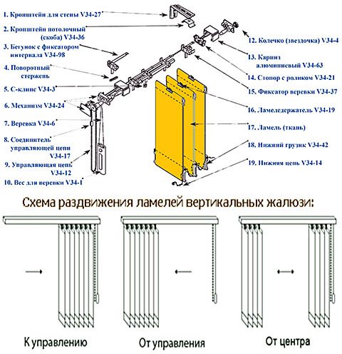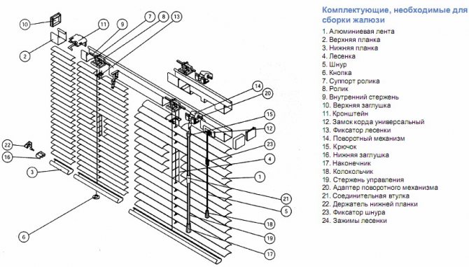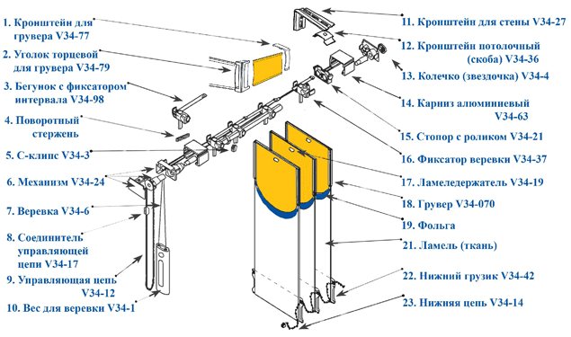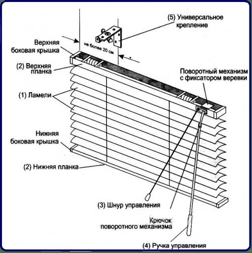 Afin que vous puissiez mieux comprendre les conseils pour réparer les stores horizontaux, il vaut la peine d'examiner de plus près leur appareil. Ce diagramme montre les principaux éléments: