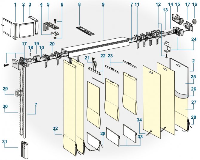 Les structures verticales comprennent une tringle à rideau, des glissières et des poids, des éléments de fixation dans une position, une chaîne de connexion, des cordes et un mécanisme de commande. Les experts estiment qu'il est préférable de choisir des tringles à rideaux en aluminium, car leurs homologues en plastique se cassent rapidement. Les produits verticaux peuvent être équipés d'éléments en plastique, en bois et en textiles denses. De plus, il existe des spécimens de fibre de verre.