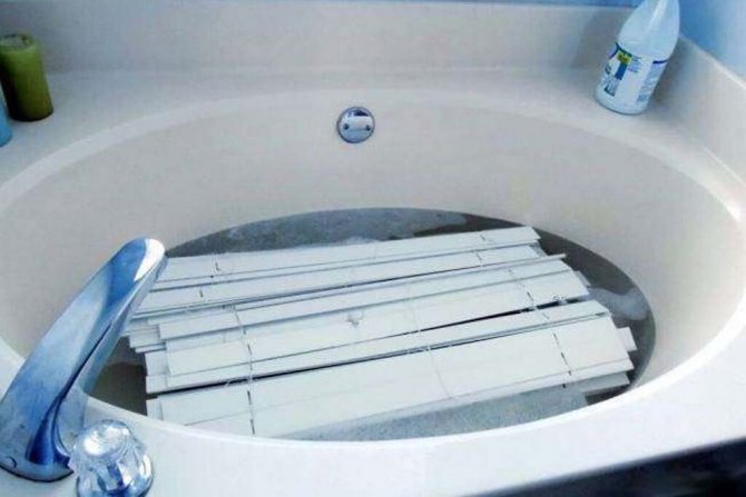 La première étape: Vous devez d'abord laver la baignoire et couvrir le fond avec un matériau doux. Ensuite, vous devez prendre de l'eau tiède et y ajouter du détergent, puis mousser abondamment. Vous devrez placer des stores dans ce bain et laisser reposer quelques minutes (une structure large doit être trempée par parties).