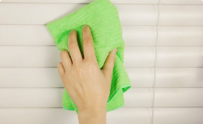 Pour ce faire, mélangez un bouchon d'assouplissant avec le même bouchon d'eau. Un chiffon humide est imprégné de la solution, puis les lamelles sont essuyées. Ce sera encore plus pratique si vous mettez du coton sur les gants en caoutchouc et enduisez les deux côtés avec vos mains.