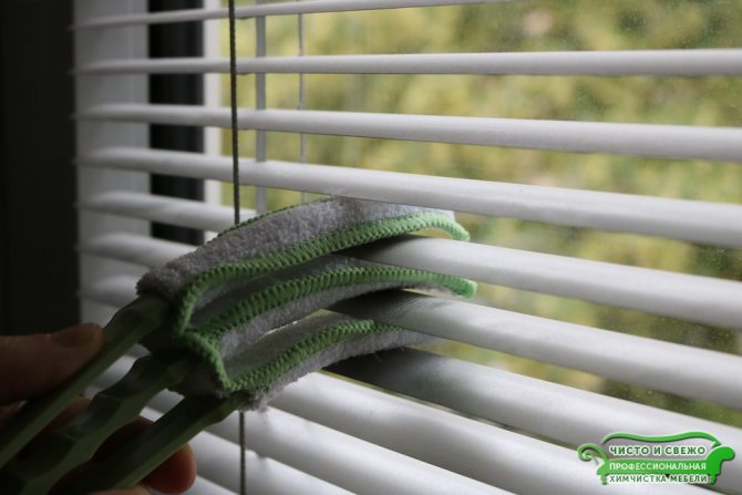 | Une fois le nettoyage terminé, il est nécessaire d'essuyer toute la toile avec une éponge avec de l'eau propre sans savon. Après cela, il sera déjà possible de passer de l'autre côté - pour cela, vous devrez retourner les lamelles des stores. | |