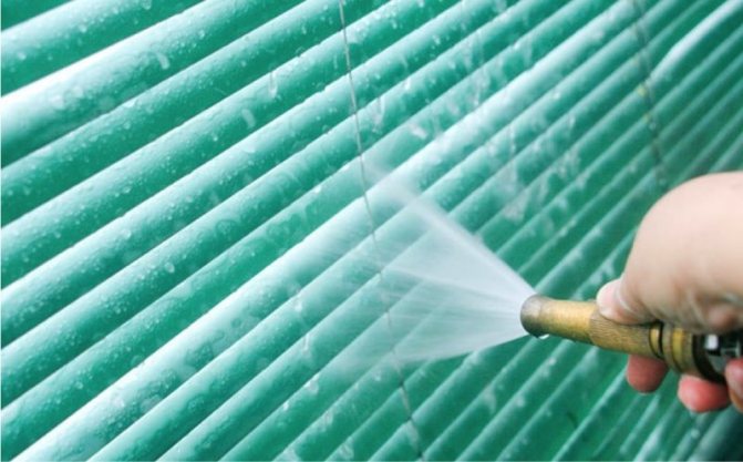Après un quart d'heure, le produit est lavé sous une puissante pression d'eau. Ce hack de vie convient aux cas où les stores en plastique sont en mauvais état, mais vous ne voulez pas passer beaucoup de temps à nettoyer.