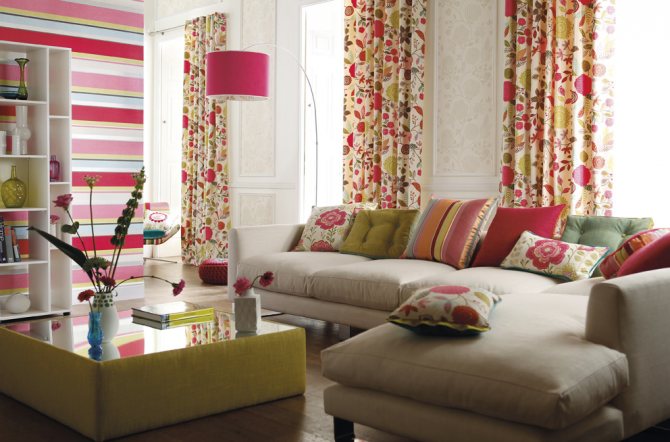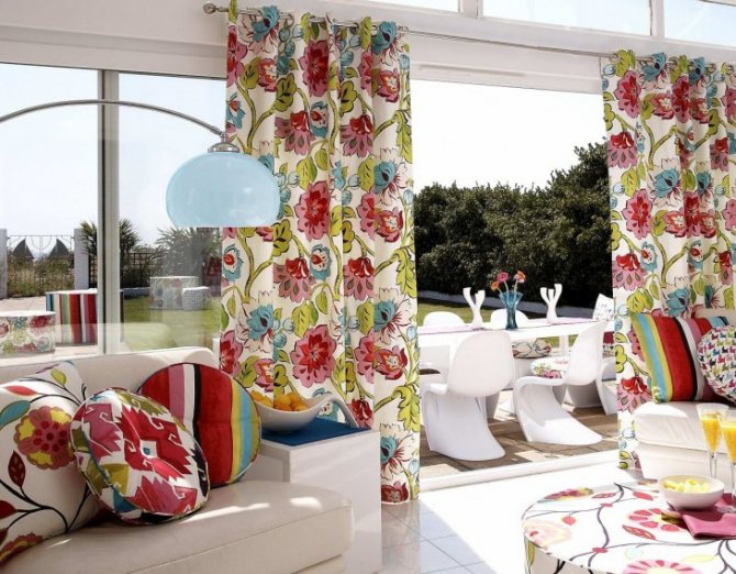 Option 3. Répétition de motifs et de dessins. La combinaison la plus inhabituelle de rideaux dans le contexte de l'intérieur dans son ensemble. Les rideaux avec de grands motifs dans les pièces spacieuses auront fière allure. En conséquence, de petits motifs accentueront parfaitement une petite pièce.