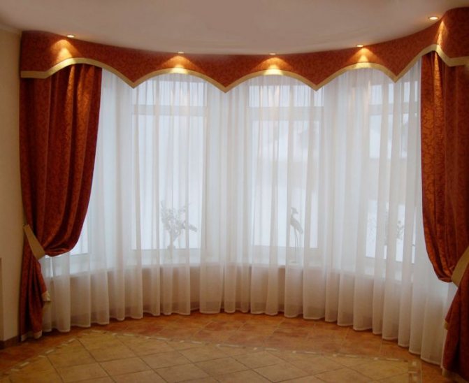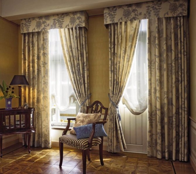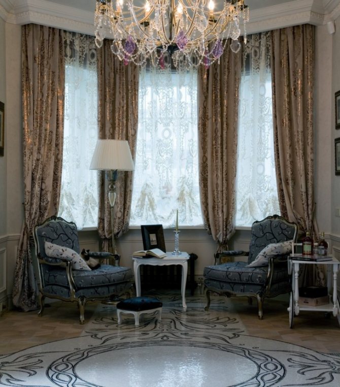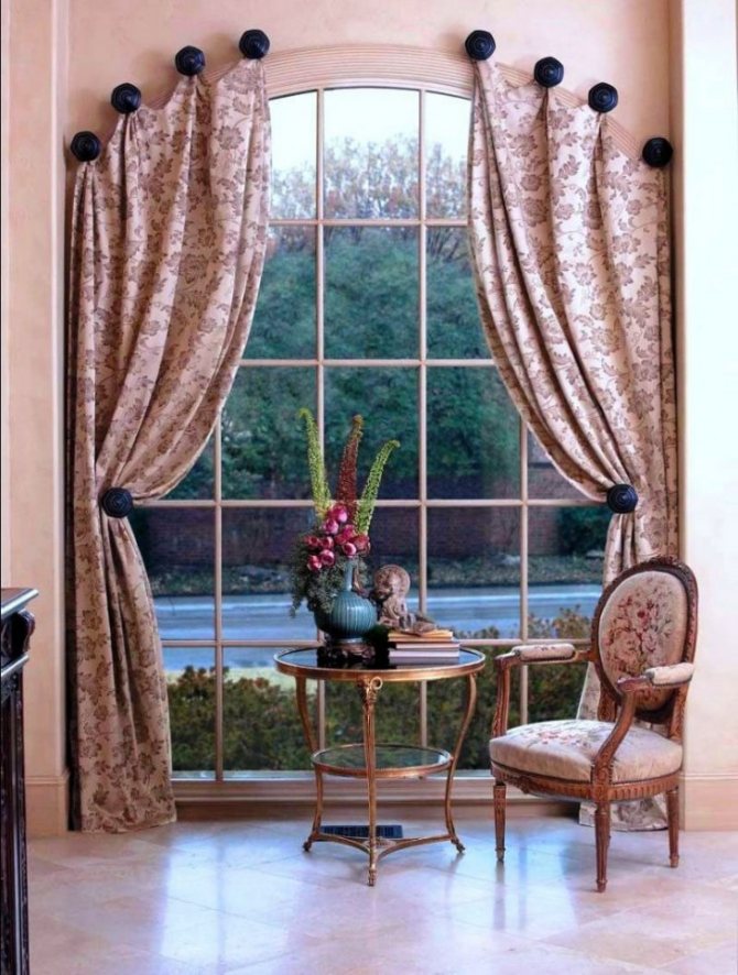 - Les espaces spacieux permettent des configurations complexes rideaux multicouches avec un lambrequin luxuriant et une cascade de plis. Des éléments décoratifs tels que des perles, des brins de perles, des cordons torsadés à pompons, des crochets qui jouent le style général de la pièce donnent un charme particulier à cette draperie.