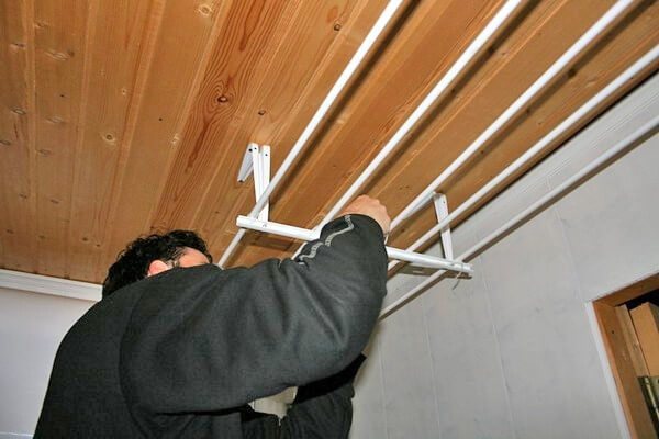 Lors du choix d'un site d'installation, il est nécessaire de vérifier la fiabilité des murs ou du plafond - les surfaces sur lesquelles les supports seront fixés. Si le plafond est recouvert de panneaux en plastique, vous devrez les retirer et installer des hypothèques sur des barres de bois. La finition en bois peut bien supporter le poids du vêtement avec le linge suspendu, mais elle peut également être renforcée si nécessaire.